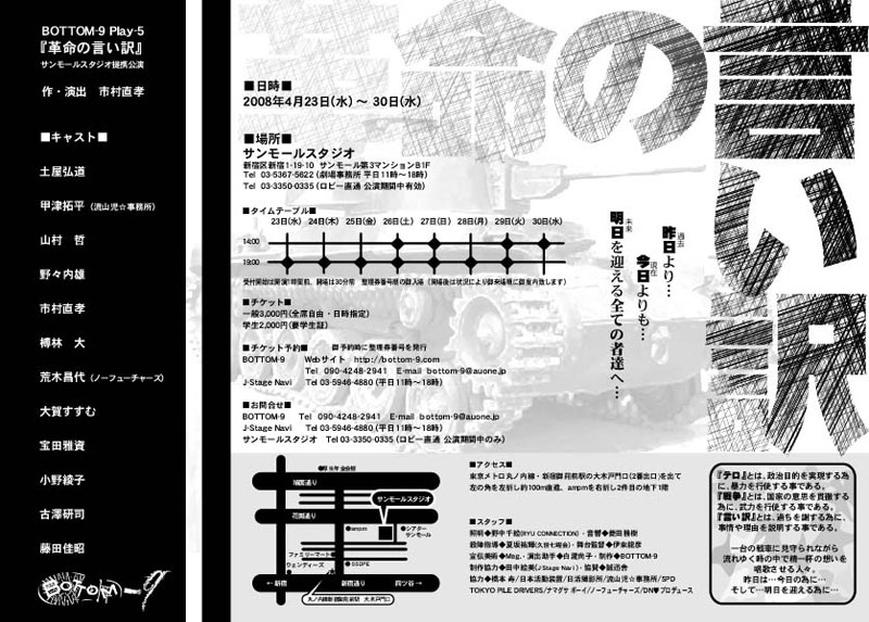 | 協力 | : | 橋本 寿 日本活動装置 日活撮影所 流山児☆事務所 SPD TOKYO PILE DRIVERS ナマグサ ボーイ ノーフューチャーズ DN プロデュース |