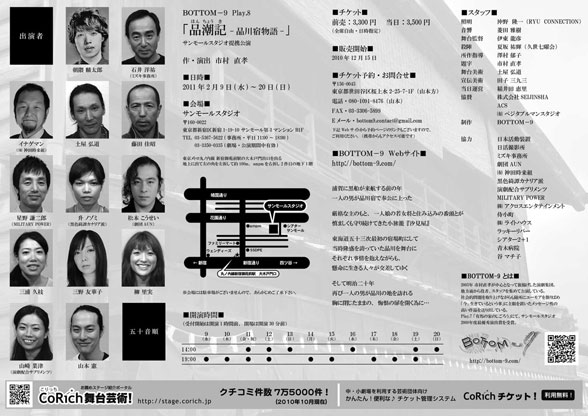 | 協力 | : | 日本活動装置 日活撮影所 ミズキ事務所 劇団AUN (有)神田時来組 黒色綺譚カナリア派 演劇配合サプリメンツ MILITARY POWER ㈱ アクロスエンタテインメント 侍小町 ㈱ ライトハウス ラッキーリバー シアター2+1 青木病院 谷 マチ子 |